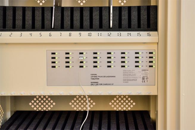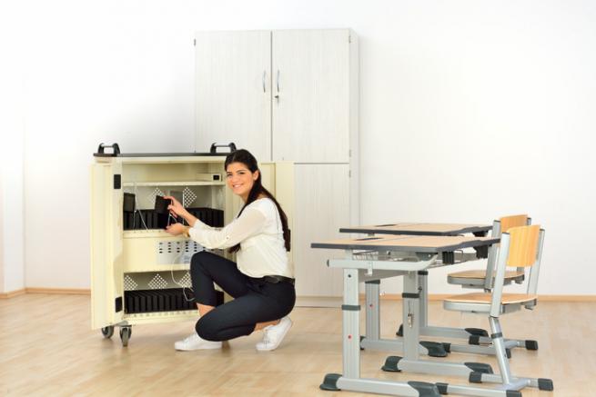 Der Tablet-Aufladewagen ist ein schicker Tausendsassa: Stromversorger mit fahrbarem Untersatz und Steharbeitsplatz in einem. Nutzen Sie die Station in jedem gewünschten Raum und laden Sie bis zu 32 Tablets oder sonstige Geräte mit USB-Anschluss einfach darin auf. Ein zentraler Anschluss mit Netzschalter befindet sich an der Außenseite. Schließen Sie den Wagen damit einfach an jeder Steckdose an. Die Tablets laden in geschützten, nummerierten Halterungen mit Status-LED auf. Zudem gibt es in der Station einen Boden zur Ablage eines Laptops mit eigener Energieversorgung.