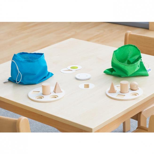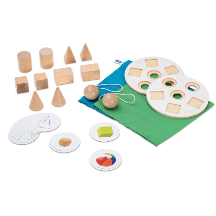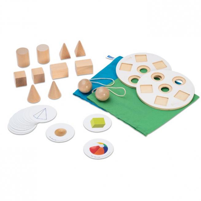 Kinder erkunden Form, Größe und Grundfläche der 12 Körper und sortieren diese auf die Holzsockel. So entdecken sie, welche Merkmale unterschiedliche Formen haben und welche geometrischen Grundlagen dahinterstecken. Hilfreich sind dabei die Spielvarianten "Paare finden", "Gegenstände entsprechenden geometrischen Körpern zuordnen" und "Grundflächen-Bingo". Ab 4 Jahren.