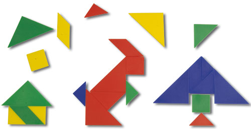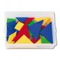 28 Teile in der praktischen Aufbewahrungsbox mit Klarsichtdeckel. 4 Tangramspiele mit je 7 Formen in Rot, Gelb, Blau und Grün.