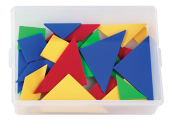 Seitenlänge: 3,5 - 10 cm, 2 mm dick. Die 28 Teile aus Kunststoff eignen sich zum Legen von geometrischen Grundformen, Symmetrien und farbigen Figuren.