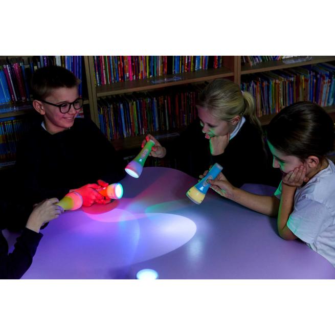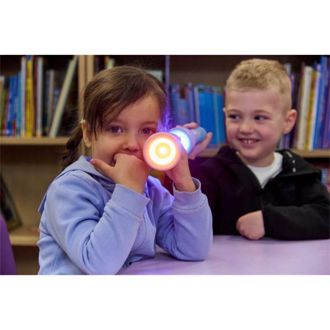 Die Taschenlampen Easi-Torch sind ergonomisch geformt und liegen den Kindern perfekt in der Hand. Die Steuerung ist intuitiv und kinderleicht: Ein einfacher Schiebeknopf ermöglicht das direkte Ein- und Ausschalten sowie schnelle Farbwechsel zwischen weißem, rotem, grünem und blauem Licht. Ideal für spontane Lichtspiele zum Entdecken von Farben, Farbmischungen und Schattenwürfen. Die gestochen scharfen LED der Taschenlampen runden das Lernvergnügen eindrucksvoll ab.