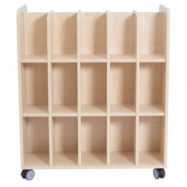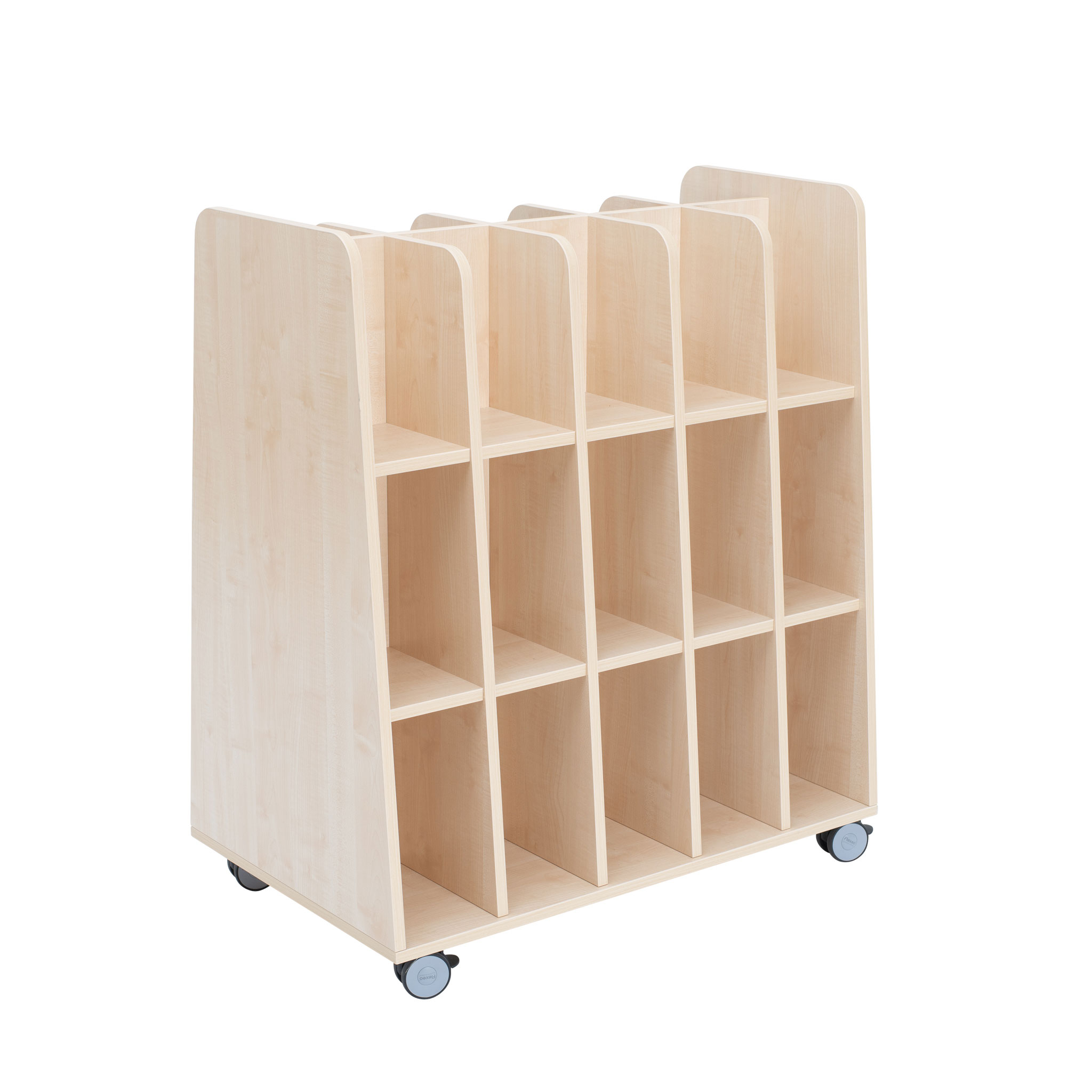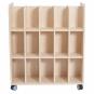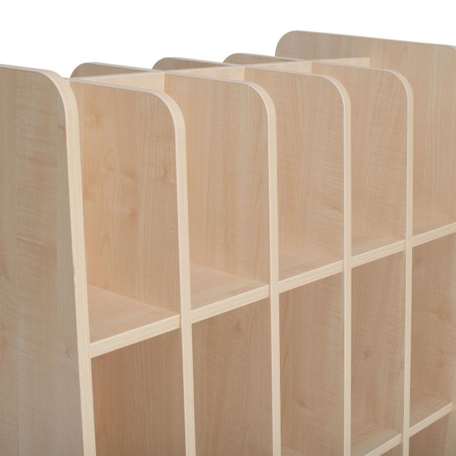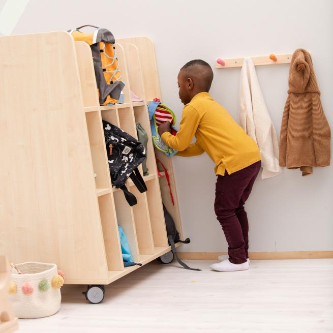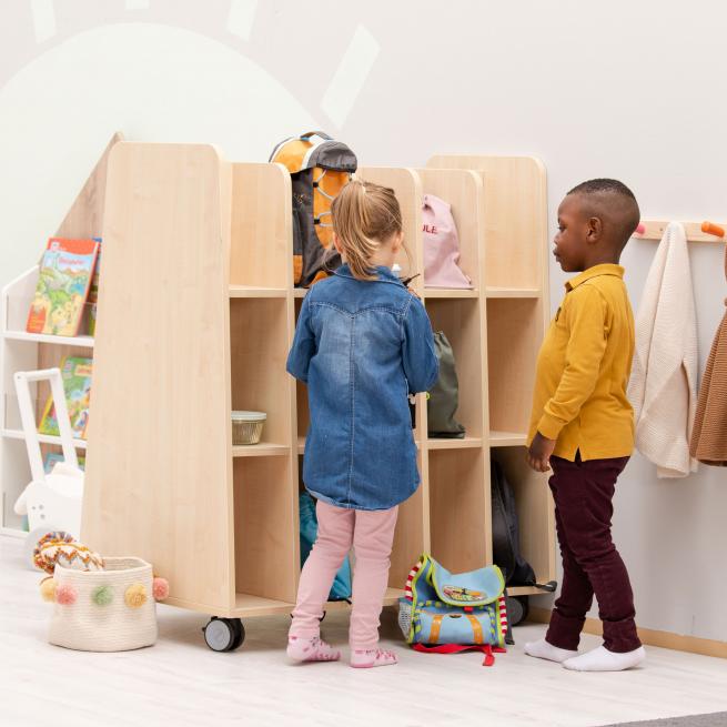 Für Ihr flexibles Raumkonzept. Den Taschenwagen nutzen Sie nicht nur als mobilen Helfer für die Garderobe, sondern auch als Raumteiler oder praktische Ordnungshilfe z. B. im Bastel- oder Essbereich. Die oben offen gestaltete Variante mit 30 Fächern erlaubt das Einstellen höherer Taschen oder Mappen. Der Wagen ist beidseitig nutzbar. Dank jeweils 5 Rollen transportieren Sie sie leicht innerhalb Ihrer Einrichtung. Für den sicheren Stand arretieren Sie 4 Rollen.