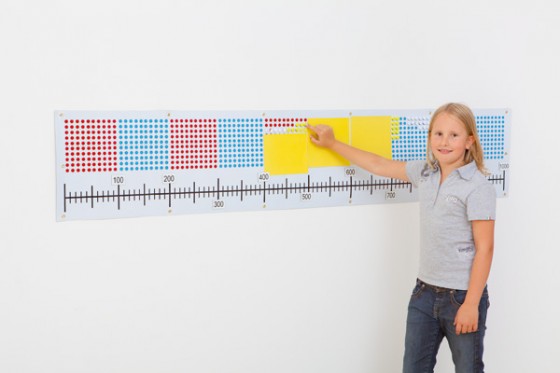 Einzelne Hunderterfelder werden mit magnetischen Wendeplatten (in Gelb-Weiß) abgedeckt. So werden auch Ausschnitte aus Hunderterfeldern dargestellt. Die gesamte Tafel ist 2 m lang und besteht aus beschichteter Eisenfolie. Material zur Wandbefestigung liegt bei.