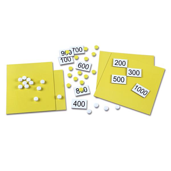 Ein farbiges Tausenderfeld mit Zahlenstrahl dient der Orientierung im Zahlenraum 1.000. Magnetische Materialien wie Zahlenkarten und Abdeckplättchen machen ein breites Lernspektrum möglich. Die Schüler erkennen, dass der Tausender aus zehn Hunderterfeldern aufgebaut ist. Zahlen können sie vergleichen und bis zum nächsten Hunderter oder Tausender ergänzen.