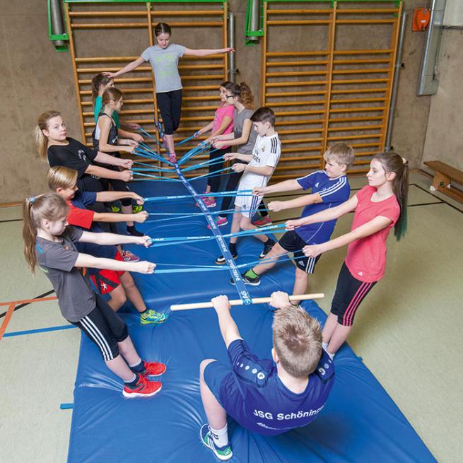 Wie man gemeinsam im Team auch mal wackelige Wege bestreitet, lernen Ihre Schüler ganz anschaulich mithilfe des Balancierbandes. Ein Ende des Bandes befestigen Sie einfach an der Sprossenwand. Um das Band zu spannen, hält ein Kind das andere Ende am Holzstab fest. Damit das Band die nötige Spannung bekommt, halten jeweils 5 Kinder auf jeder Seite die Schlaufen fest. Nun kann ein Kind über das Band balancieren. Für bis zu 80 kg Körpergewicht geeignet.