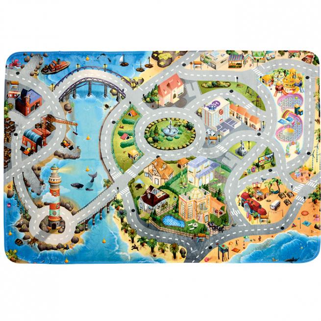 Herrlich: Einfach ins Cabrio springen und bei leichter Brise die Küstenstraße entlangfahren. Auf diesem detailreichen Teppich in strahlenden Farben erleben Kinder die tollsten Fahrten ins Blaue. Ob am Leuchtturm vorbei, über die große Brücke, durch den Kreisverkehr zum Vergnügungspark oder zum Strand – hier ist der Weg das Ziel.