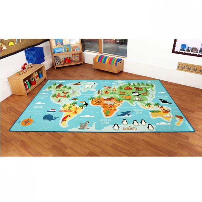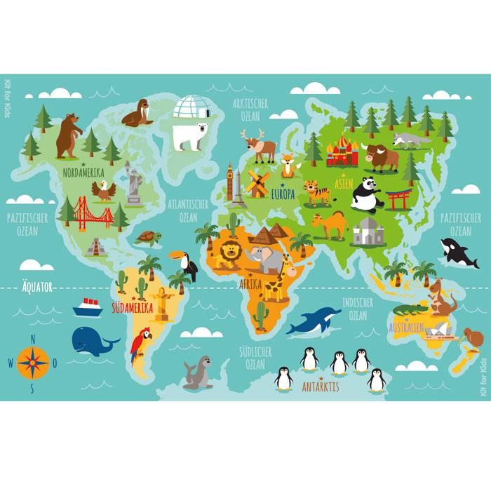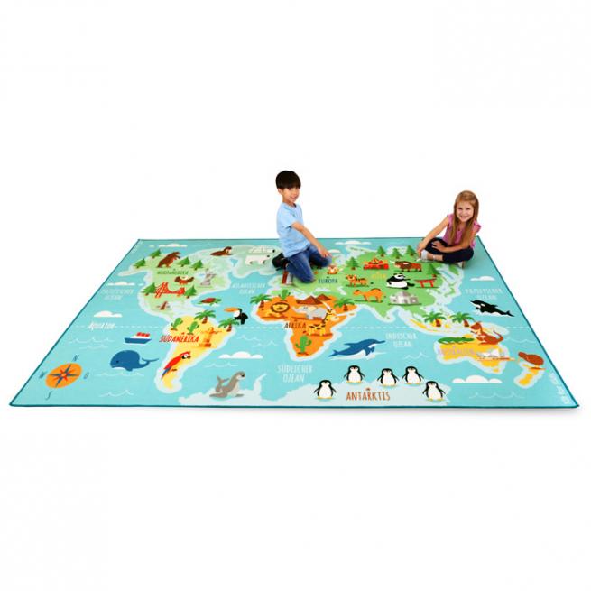 Wo der drollige Pandabär beheimatet ist, welcher Vogel wie ein Obst heißt, woher die Rentiere vom Weihnachtsmann stammen, wo Bären, Tukane, Wale, Elefanten, Löwen sowie Giraffen und noch viele weitere Tierarten zu Hause sind, erkunden Ihre Kinder auf dem großen Teppich. Auf dem weichen Spielteppich ergeben sich viele Sprechanlässe.