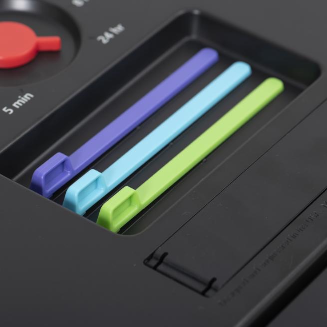 • 3 austauschbare, doppelseitige Ziffernblätter für 6 unterschiedliche Zeiträume (eine Blattseite zum Selbstbeschriften)