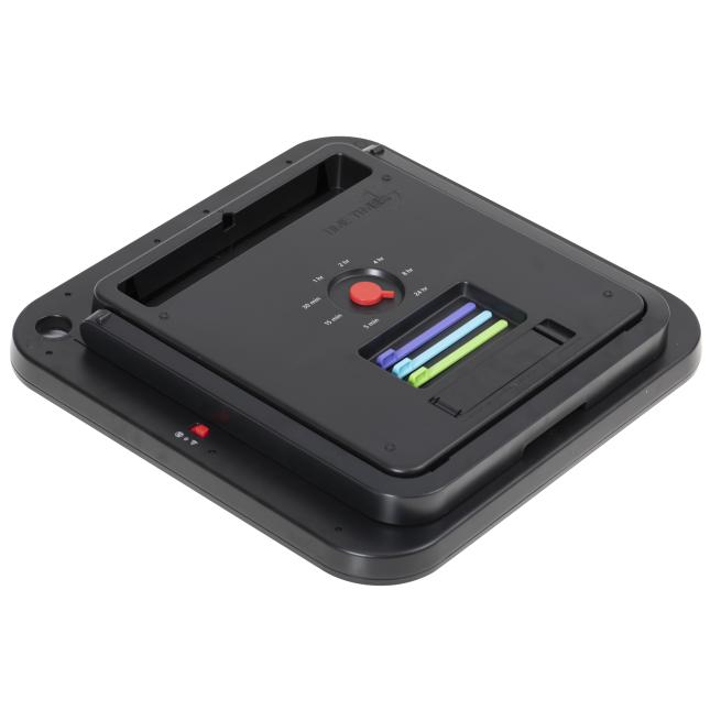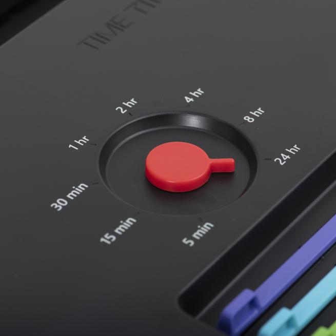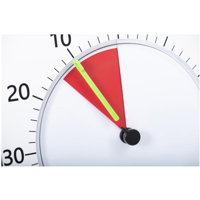 Zum Zubehör gehören 3 doppelseitige, etwa ringförmige Ziffernblätter, die Sie im Handumdrehen auflegen oder untereinander austauschen. 5 Blattseiten zeigen dabei vordefinierte Zeiträume (5, 15, 30, 60 und 120 Minuten), eine unbeschriftete Seite gestalten Sie ganz individuell. Die jeweils passende Zeiteinstellung nehmen Sie auf der Rückseite der Uhr vor. Sobald alles läuft, kommt der farblich zweigeteilte Mittelkreis ins Spiel: Der weiße Bereich zeigt die verstrichene Zeit, der rote die noch zur Verfügung stehende Zeit an. Bewegt sich der Zeiger weiter, verringert sich langsam der sichtbare Teil des roten Farbfelds. Ist die eingestellte Zeit abgelaufen, ertönt ein Signal (diese Funktion lässt sich über einen Schalter auf der Rückseite der Uhr deaktivieren). Dank der optischen sowie akustischen Unterstützung ist für die Kids sinnlich greifbar, wie viel Zeit für eine jeweilige Aktivität noch übrig ist und wann es nötig ist, zum Ende zu kommen. Wollen Sie den gewählten Zeitraum noch weiter unterteilen, bringen Sie am jeweiligen Ziffernblatt ganz einfach die praktischen farbigen Zeitmarker an.