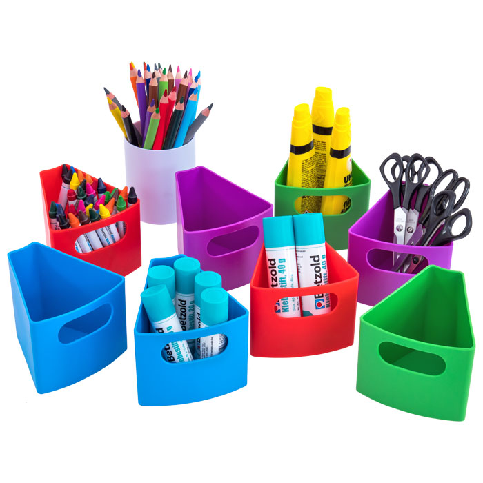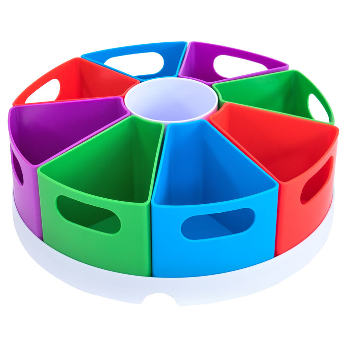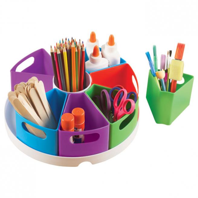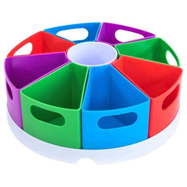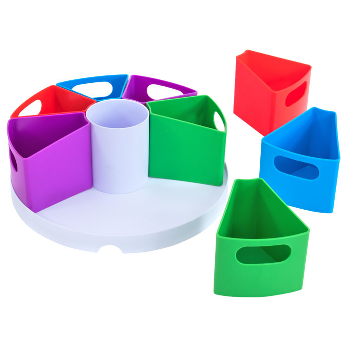 Utensilien für die Gruppen-, Stations- oder Teamarbeit sind dank Tisch-Organizer sofort griffbereit. So bleibt der Arbeitstisch immer gut sortiert. Im Set enthalten sind 8 herausnehmbare Materialboxen in Blau, Grün, Magenta und Rot. Das Träger-Rondell ist mit einem runden Fach in der Mitte ausgestattet. Dank großer Grifföffnungen ist das Entnehmen und das Einstellen besonders leicht.