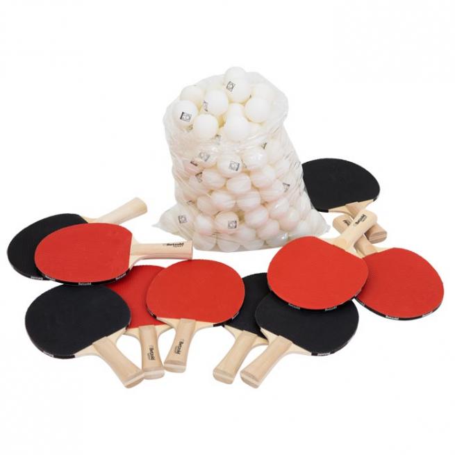 10 Schläger mit Gummibelag und Holzgriff144 weiße Kunststoffbälle