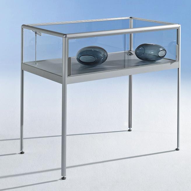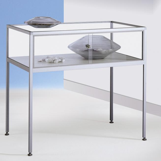 Superschicker Hingucker für Exponate. Wertet auch kleine Räume oder schmale Eingangsbereiche auf. Diese Tischvitrine ist ausgestattet mit einem Sichtboden in silberfarbener Dekorplatte, 22 mm starkem Aluminiumrahmen, Schiebetüren, und Zylinderschloss. Der Vitrinentisch ist 5-seitig verglast mit ESG-Einscheibensicherheitsglas nach DIN 1249 bzw. EN 12150.