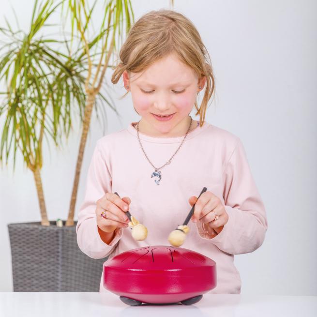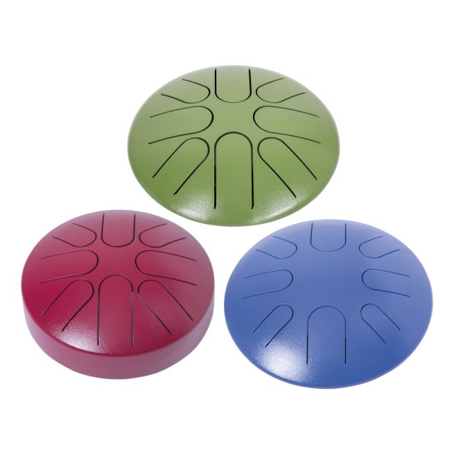 Auf dem Stahl-Klangkörper befinden sich jeweils 8 Klangzungen. Jede Zunge hat ihren eigenen Tonleiterton. Mit den Händen oder beiliegenden gepolsterten Holz-Schlägeln schlagen Sie und Ihre SuS die Trommeln an. Auf der roten oder grünen erklingen die Töne jeweils als C-Dur- und auf der blauen als G-Dur-Tonleiter. Sitzend oder stehend bespielbar.