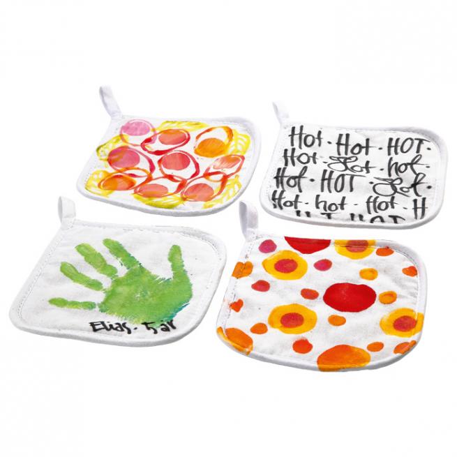 Aus den 4 weißen Topflappen kreieren Sie mit Ihren Kindern im Handumdrehen kreative Geschenke für Geburtstage, Mutter- und Vatertag sowie für Ostern und Weihnachten. Ganz einfach mit Stoffmalfarbe bemalen (bitte separat bestellen). An der praktischen Schlaufe hängen Sie die Topflappen als Deko oder für den Gebrauch griffbereit auf.