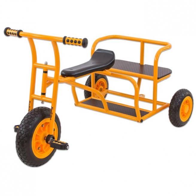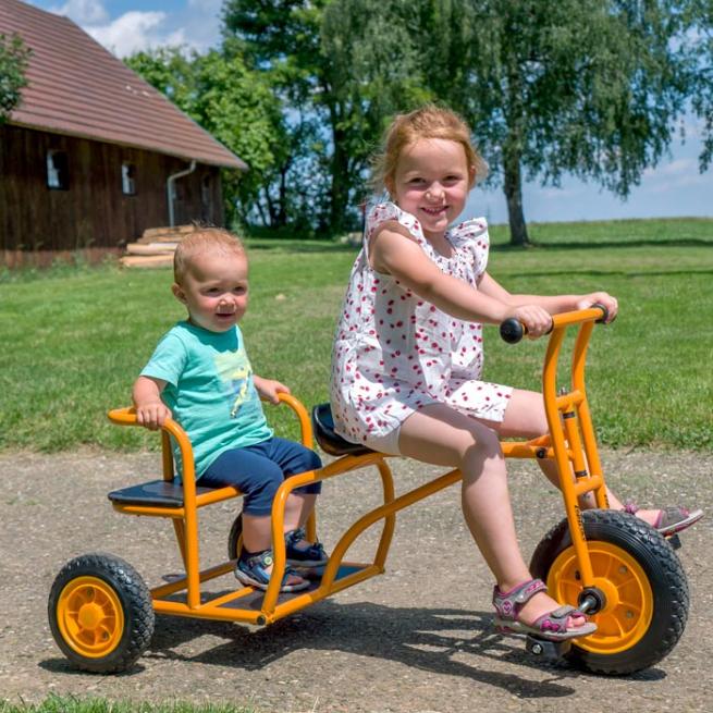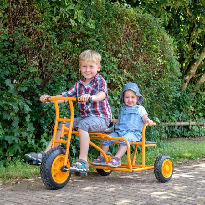 Braucht jemand eine Mitfahrgelegenheit? Mit dem Taxi geht es durch den Kindergarten und den Außenbereich. Bis zu 2 Passagiere chauffiert das jeweils fahrende Kind auf der Rückbank »seines« Doppeltaxis. Bitte beachten Sie: das Fahrzeug hat keine Bremse.