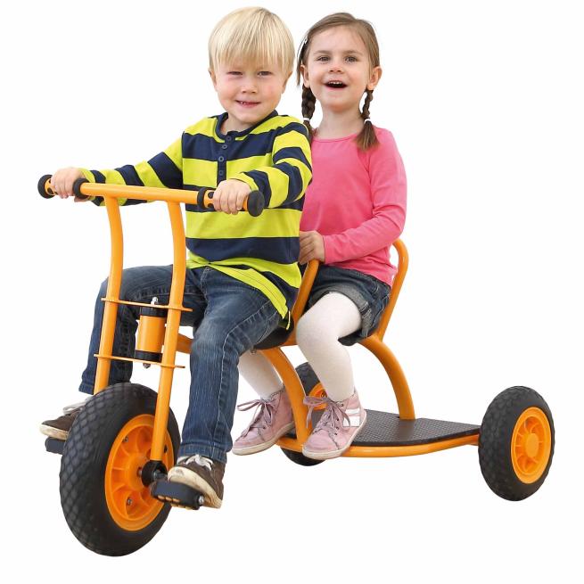 Mit diesem Dreirad Taxi bringen die Kinder ihre Freunde ganz einfach von A nach B. Der Fahrgast steigt auf den hinteren Sitz und kann seine Füße sicher auf dem großen Antirutschbrett abstellen. Die beiden Rückenlehnen sorgen für noch mehr Komfort.