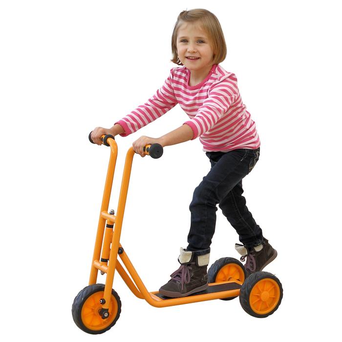 Mit diesem kleinen Roller kommen schon Kinder ab 2 Jahren auf ihre Kosten, auch wenn sie noch nicht so gut das Gleichgewicht halten können. Die zwei hinteren Räder sorgen für einen festen Stand und verhindern, dass der Roller umfällt. Während sich das Kind mit dem einen Fuß am Boden abstößt, steht der andere Fuß sicher auf dem rutschfesten Trittbrett. Hier kann Jeder ganz leicht sein eigenes Tempo bestimmen und nebenbei Balance, Motorik und rücksichtsvolles Fahren schulen.