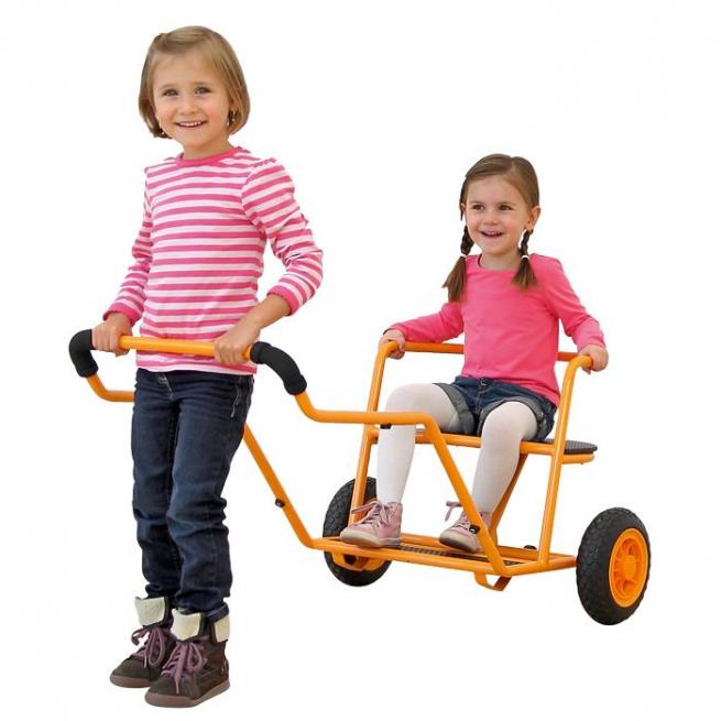 Pferdchen spielen mal anders – der Fahrer bzw. das Pferdchen zieht die Kutsche sicher an der Stange. Die EVA-Griffe sorgen für einen sicheren Griff. Hinten kann es sich ein zweites Kind gemütlich machen und sich kutschieren lassen. Die langlebige Rikscha ist robust und wetterfest gebaut und bietet durch das kleine Stützrad am hinteren Ende noch zusätzliche Stabilität.