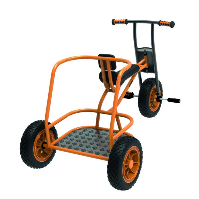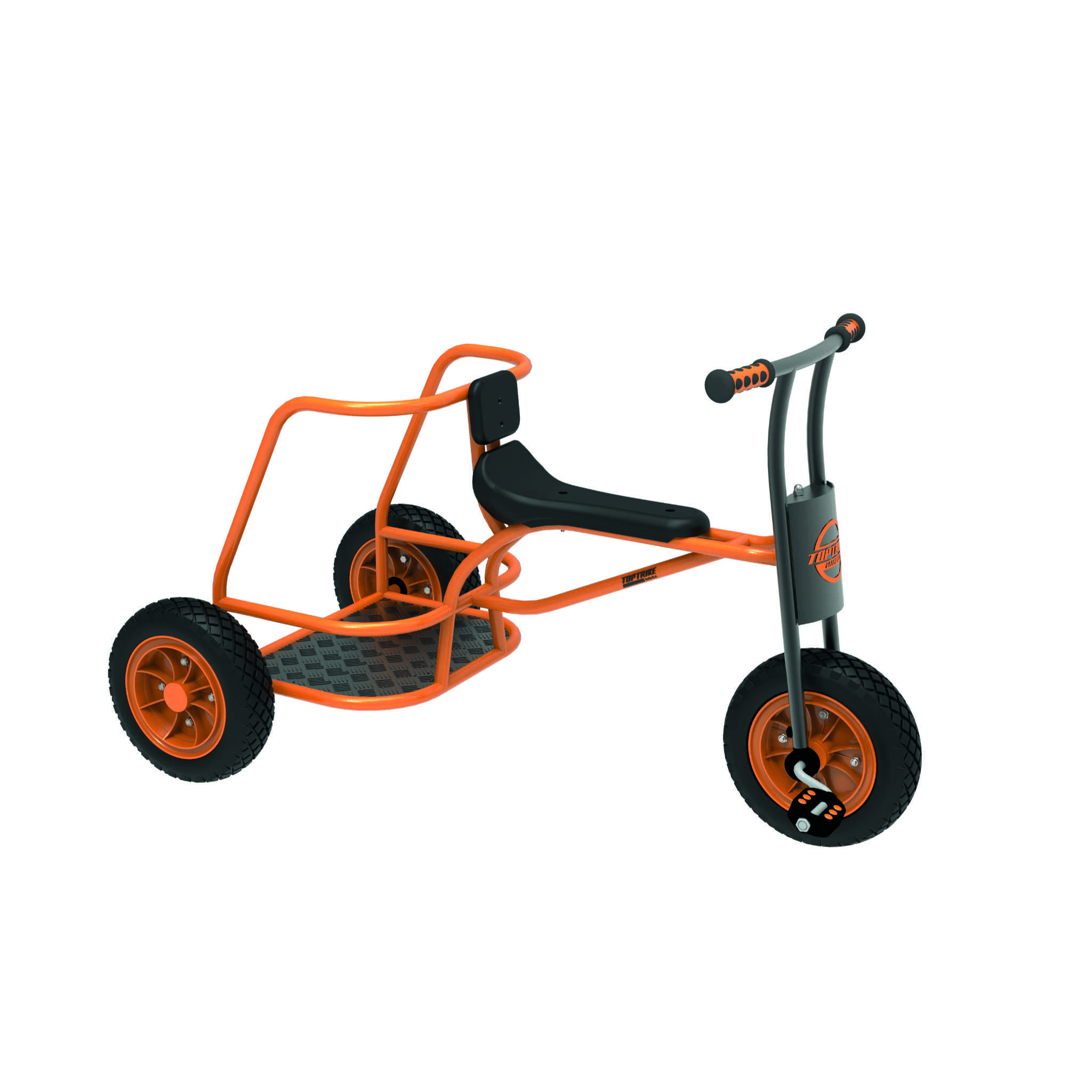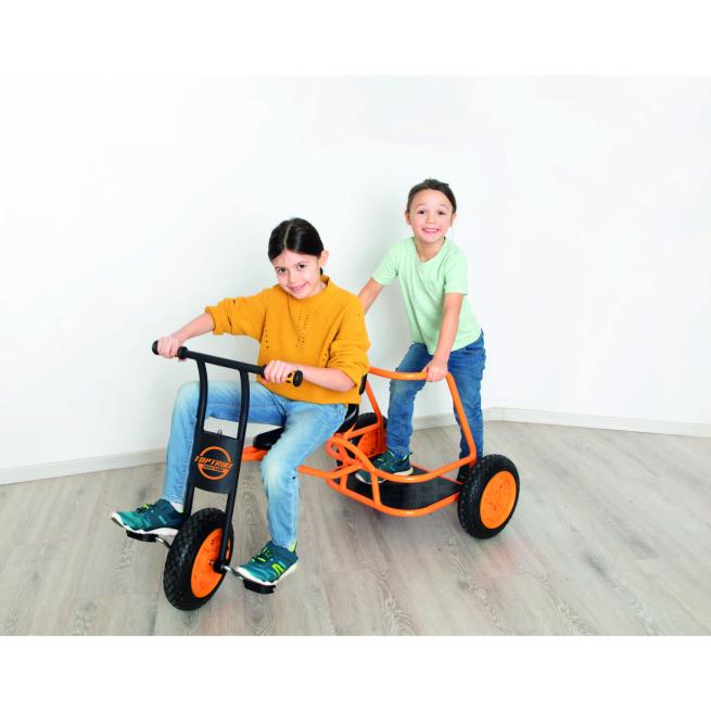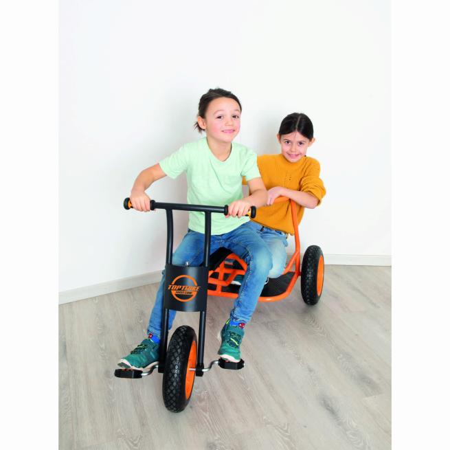 Das Shuttle Trike Maxi ist antiker Rennwagen, Rikscha und Reisebus in einem. So geht auf dem Pausenhof ordentlich die Post ab. Das Kind auf dem Vordersitz übernimmt Antrieb und Lenkung, während ein zweites Kind auf der hinteren Standfläche Platz findet. Dabei sorgt die bewährte TopTrike-Qualität für langanhaltenden Fahrspaß, exzellente Fahrsicherheit und absolute Langlebigkeit: Die Handgriffe am Lenker sind bestens zu packen, die Trittfläche ist rutschfest und robust – dank Fertigung aus geriffelter und pulverbeschichteter Aluminiumplatte. Durchgeschäumte EVA-Reifen, laufruhig und elastisch, lassen das Shuttle Trike Maxi bestens über den Pausenhof gleiten, das hochwertige Fahrzeuggestell aus pulverbeschichtetem Stahlrohr sorgt zusätzlich für astreine Stabilität und Haltbarkeit.