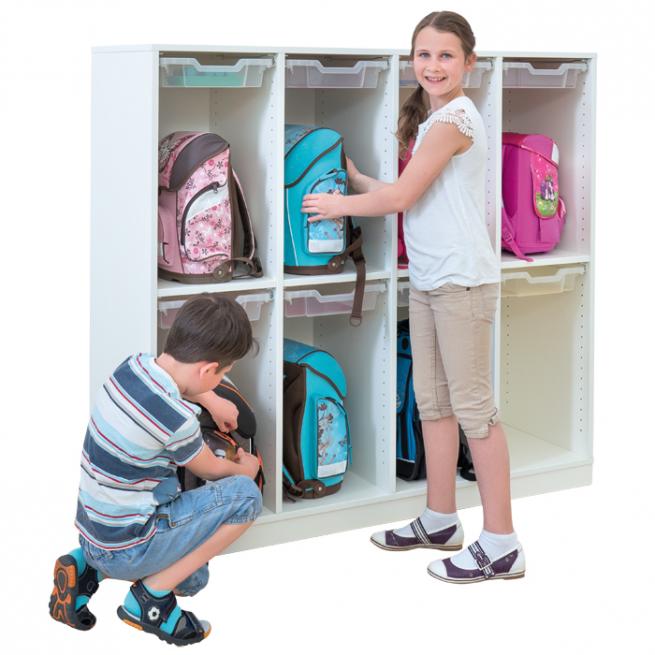 Für extra Ordnung. In diesen 2-, 3- oder 4-reihigen Regalen mit praktischen Ablagefächern oder flachen bzw. hohenm Boxen bringen Ihre Schüler ihre Rucksäcke, Tornister oder Turnbeutel und wichtige Arbeitsmaterialien unter. Die Sachen sind sicher verstaut und stehen nicht im Weg.