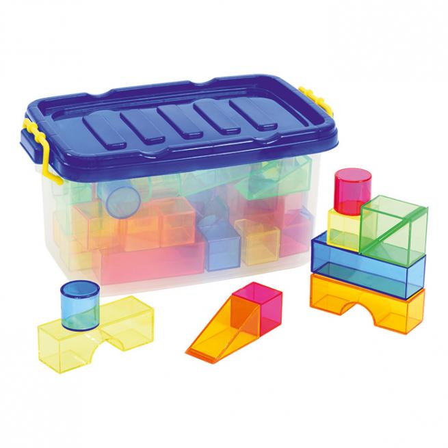 6 verschiedene Formen in 5 Farben laden die Kinder zum Bauen, Spielen und Entdecken ein. Stellen sie ihre Bauwerke auf einen Lichttisch, scheinen die Bausteine selbst zu leuchten.