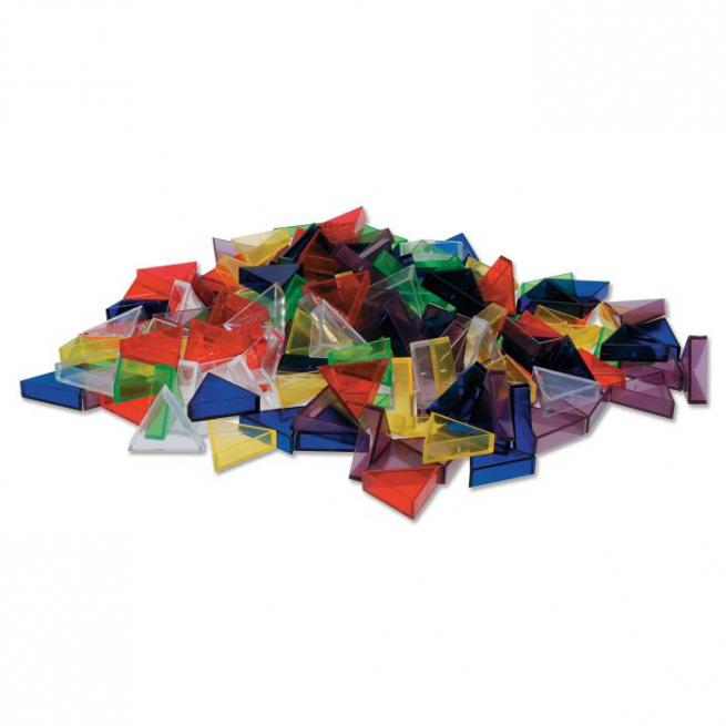 Aus den geometrischen Legesteinen entstehen zauberhafte Mosaike. Die transparenten Kunststoffsteine lassen das Licht farbig durchschimmern. Die Kinder legen Muster aus dreieckigen und trapezförmigen Elementen.