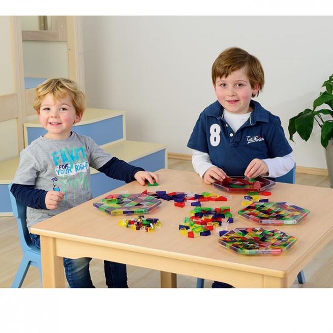 Aus den geometrischen Legesteinen entstehen zauberhafte Mosaike. Die transparenten Kunststoffsteine lassen das Licht farbig durchschimmern. Die Kinder legen Muster aus dreieckigen und trapezförmigen Elementen.