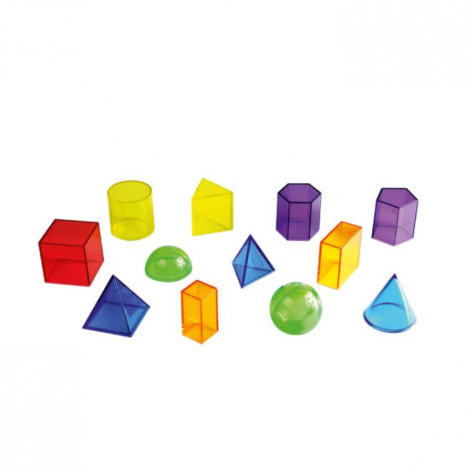 Mithilfe des dreieckigen Prismas, der großen und kleinen rechteckigen sowie fünf- und sechseckigen Prismen, der dreieckigen und der quadratischen Pyramide sowie des Zylinders, der Kugel, der Halbkugel, dem Kegel und des Würfels erklären Sie Ihren Kindern anschaulich, was geometrische Formen sind. Jeweils eine Seite ist abnehmbar. Praktisch, um z. B. Flüssigkeiten einzufüllen, um das Volumen zu erläutern. Ab 5 Jahren.