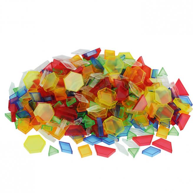 Erste Erfahrungen mit geometrischen Formen machen Ihre Kinder mit den 360 transparenten gelben Sechsecken, grünen Dreiecken, blauen Rauten, orangefarbenen Quadraten, roten Trapezen und farblosen Rauten. Inklusive praktischer Stapelbox.