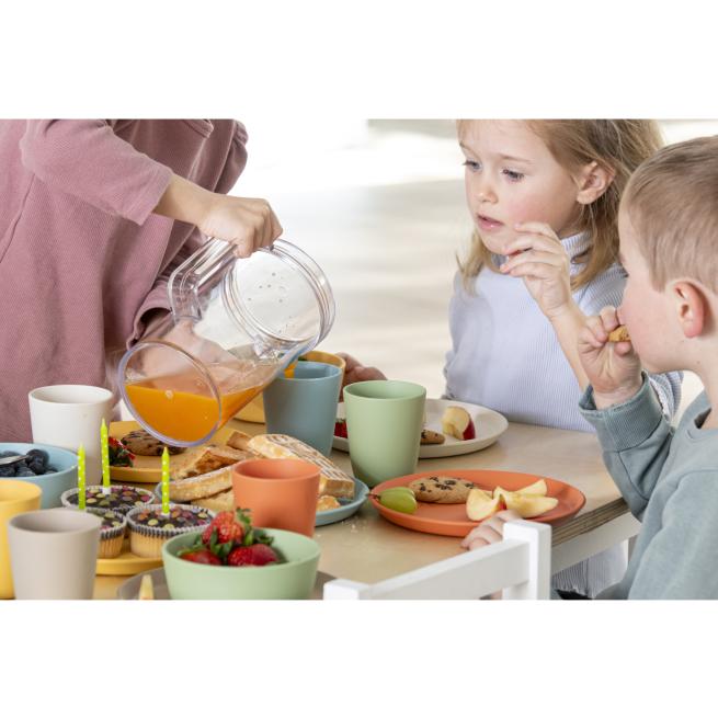 Ob Frühstück, Mittag oder Snack-Zeit – dieses robuste Geschirr-Set aus treeNside-Material passt optimal in den dynamischen Alltag von Krippe, Kita und Schule. Teller, Schüsseln und Becher sind ergonomisch auf Kinderhände abgestimmt und bewähren sich Tag für Tag beim gemeinsamen Essen. Das Set besteht aus 36 Teilen und eignet sich für bis zu 12 Kinder. Stapelbar und bruchsicher. Stärken Sie das Gemeinschaftsgefühl beim Essen. Dank seiner durchdachten Formgebung greifen auch Kleinkinder sicher zu Becher und Schüssel. Das Material hält dem Trubel am Tisch stand – selbst, wenn mal etwas hinfällt. Optisch punktet das Geschirr mit natürlichen Farben und einem Symbol für Wertschätzung: Drei Blätter als Zeichen der Dankbarkeit – ein wertvoller Impuls für die Esskultur in Ihrer Einrichtung.