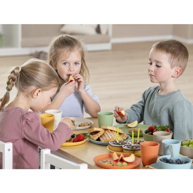 Ob Frühstück, Mittag oder Snack-Zeit – dieses robuste Geschirr-Set aus treeNside-Material passt optimal in den dynamischen Alltag von Krippe, Kita und Schule. Teller, Schüsseln und Becher sind ergonomisch auf Kinderhände abgestimmt und bewähren sich Tag für Tag beim gemeinsamen Essen. Das Set besteht aus 36 Teilen und eignet sich für bis zu 12 Kinder. Stapelbar und bruchsicher. Stärken Sie das Gemeinschaftsgefühl beim Essen. Dank seiner durchdachten Formgebung greifen auch Kleinkinder sicher zu Becher und Schüssel. Das Material hält dem Trubel am Tisch stand – selbst, wenn mal etwas hinfällt. Optisch punktet das Geschirr mit natürlichen Farben und einem Symbol für Wertschätzung: Drei Blätter als Zeichen der Dankbarkeit – ein wertvoller Impuls für die Esskultur in Ihrer Einrichtung.
