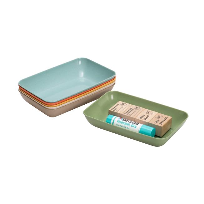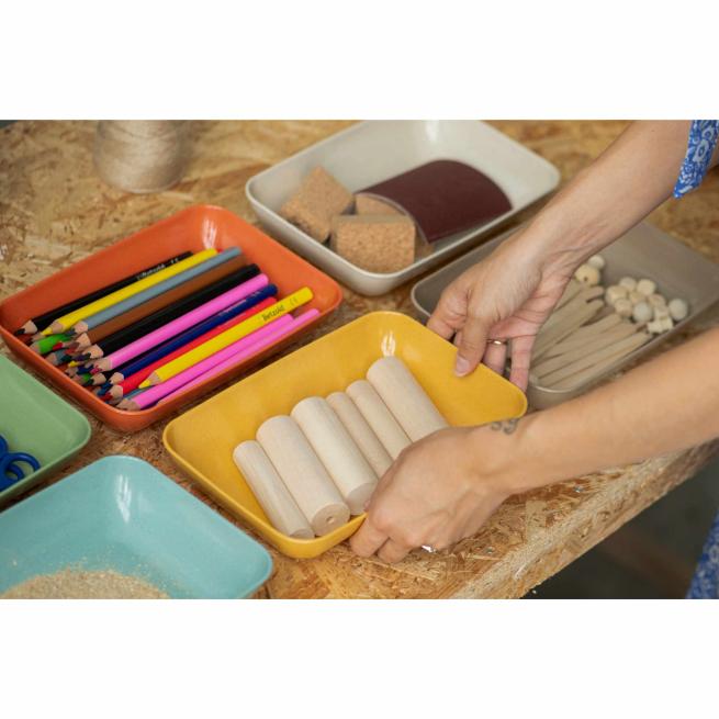 Halten Sie nachhaltig Ordnung! Die stapelbaren Schalen in 2 unterschiedlichen Größen haben sichtbare Holzfasern. Sogar einen dezenten Holzgeruch nehmen Sie wahr. Die Materialschalen sind die optimale Sammelstelle für Bastel- bzw. Büromaterial, Stifte, Scheren und vieles mehr.