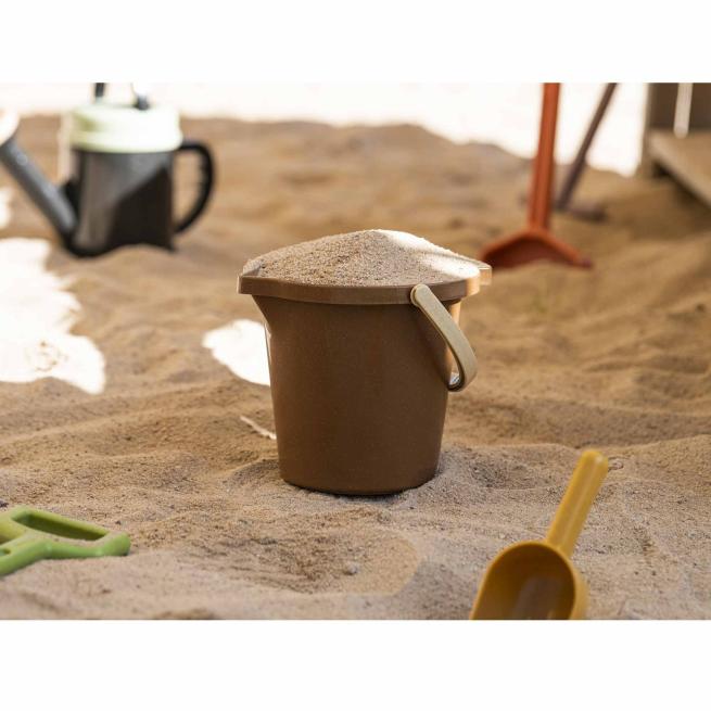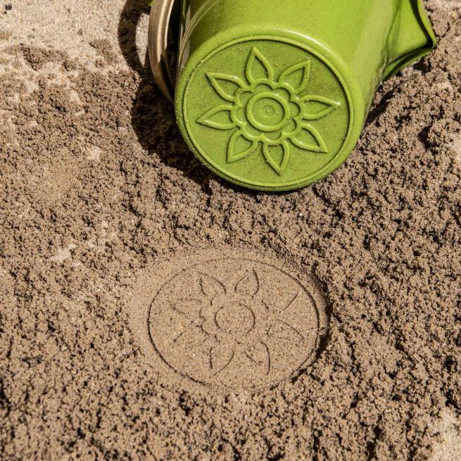 Der Sandspiel-Eimer aus umweltfreundlichem treeNside-Biokunststoff bereichert jeden Sandkasten! Robust und wetterfest, eignet er sich perfekt zum intensiven und ausdauernden Gebrauch. Der Henkel ist griffig für Kinderhände. Auf der Unterseite besitzt der Eimer ein Mandala, das die Kinder in den Sand eindrücken. Besonders gut klappt das, wenn der Sand feucht ist. Die Kinder haben ihre helle Freude und erschaffen ihre ganz eigenen, kunstvollen Motive im Sand, z. B. indem sie den Eimerboden in der Luft weiterdrehen und erneut auf das frische Muster im Sand drücken.