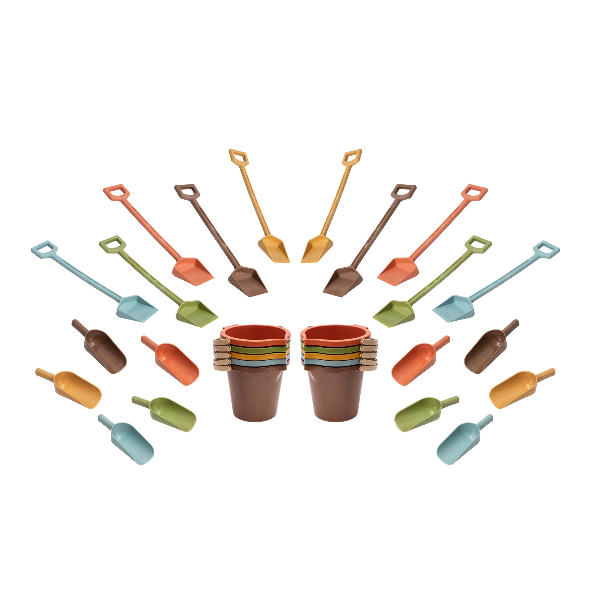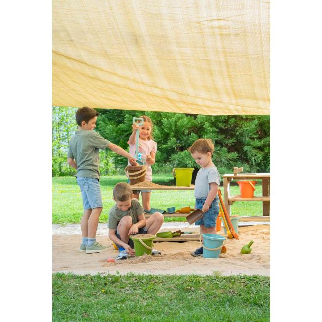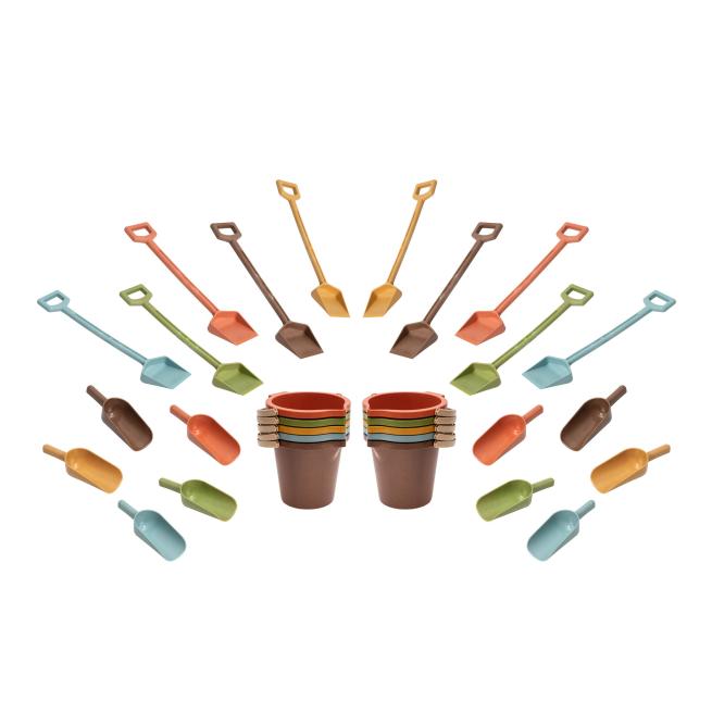 Stabiles Buddelwerkzeug im 30-teiligen Set aus 10 Handschaufeln, 10 Spaten und 10 Eimern. Da dürfen die Kids kräftig loslegen! Das griffige Spielmaterial liegt den Kindern dabei ausgezeichnet in der Hand. Alle Teile sind aus robustem treeNside-Biokunststoff hergestellt und eignen sich wunderbar für den ausgiebigen und regelmäßigen Gebrauch. Die Utensilien eignen sich sowohl für das Spielen im Sand als auch zum Graben in lockerer Erde.