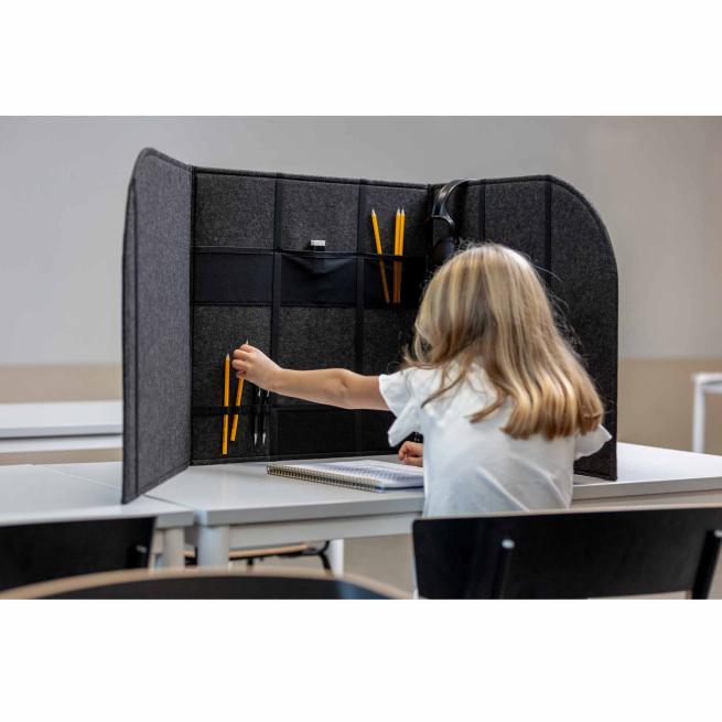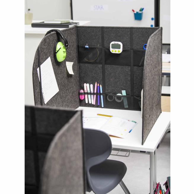Was sich frühere Schulkinder aus Etuis und Schulbüchern selbst zusammenbauen mussten, ist heute als Profi-Produkt verfügbar: Die faltbare Trennwand mit Fächern ist blickdicht und aus geräuschreduzierendem Material. Steht die Trennwand auf dem Tisch, lernen Ihre SuS mit erhöhter Konzentration, besonders hilfreich in Stillarbeitsphasen oder bei Tests und Klassenarbeiten.