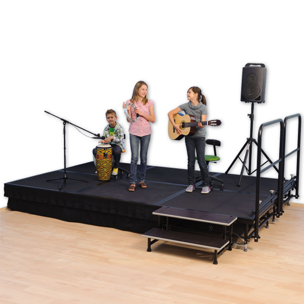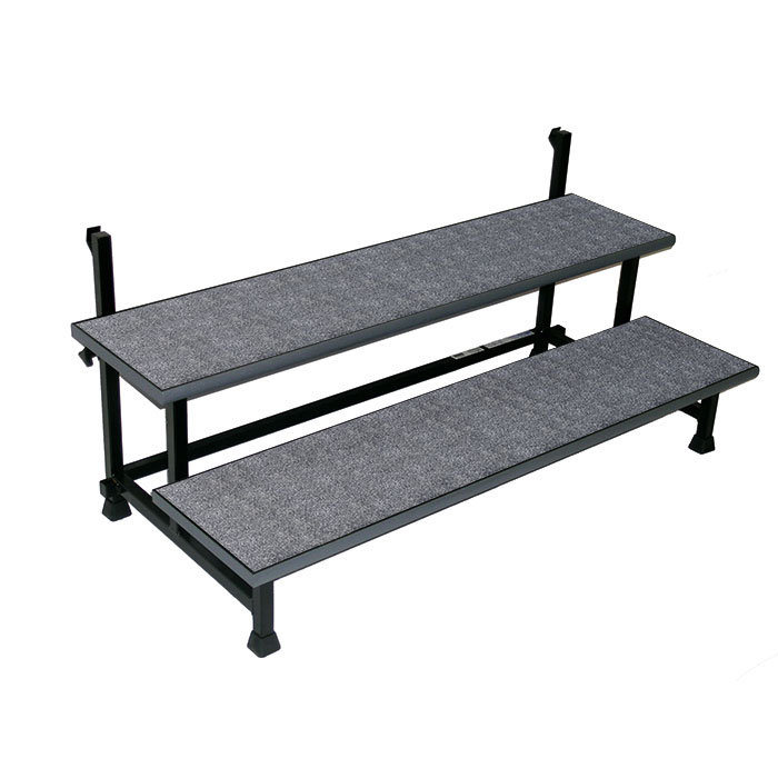 2 Stufen à 20 cm mit Teppich in Lichtgrau belegt. Wird werkzeuglos am Bühnenelement angebracht. Passt dank mitgeliefertem Adapter an Bühnenelemente mit Höhe 40 cm und 60 cm, 23 kg