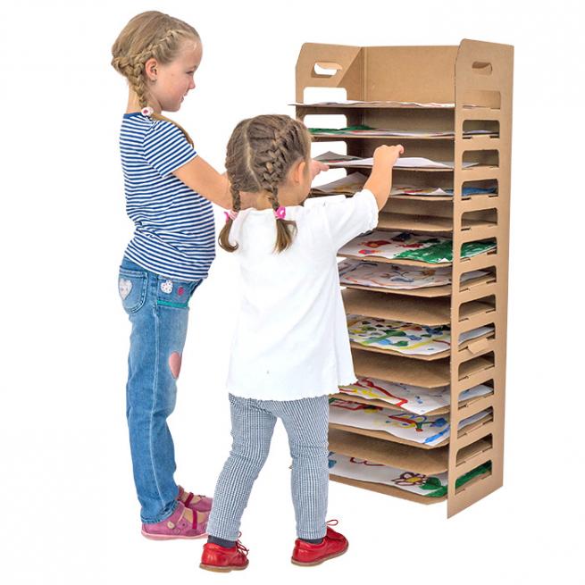In unserer Schülerbetreuung werden unterschiedlichste Bilder gemalt, gestaltet, die teils trocknen müssen oder noch nicht fertig gestellt sind. Damit die einen guten Platz finden, bis sie nach Hause mitgenommen werden können, findet das Trockengestell Verwendung.