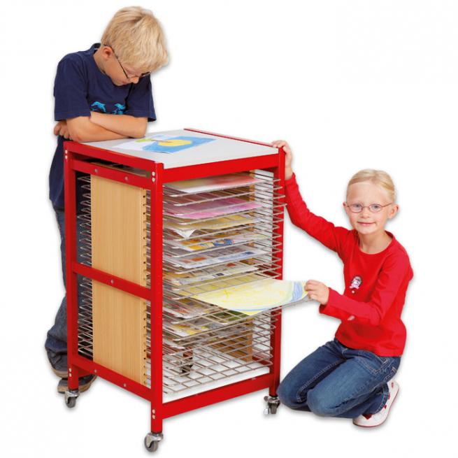Bis zu 25 DIN A3-Bilder haben in diesem Wagen Platz. Das schafft Raum auf Fensterbänken, Heizungen und Tischen. Zudem bleibt der Gruppenraum sauber, denn die frischen Meisterwerke trocknen separat und geschützt im Trocknungswagen. Die Gitter sind verzinkt. Dadurch sind sie äußerst langlebig und vor Nässe geschützt. Der Stahlrahmen ist besonders stabil und die Lackierung sehr widerstandsfähig. Bis zu 25 Ablagen passen in die Ablagenführung aus Holz im Dekor Buche. 4 Rollen machen den Wagen mobil, 2 feststellbare Rollen sorgen für den sicheren Stand.