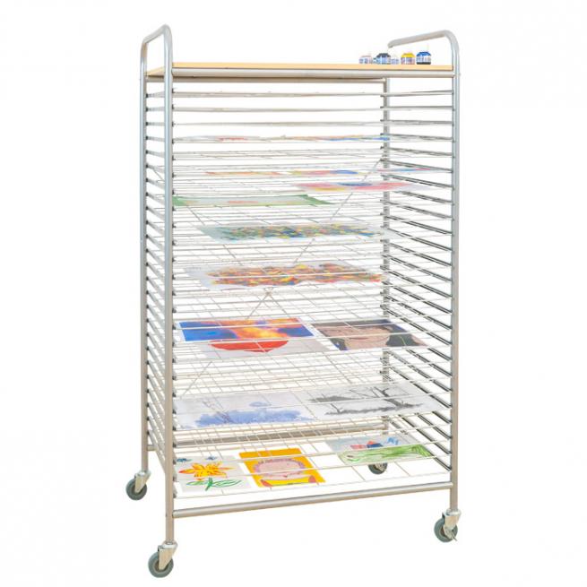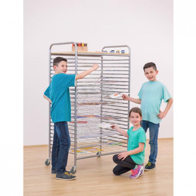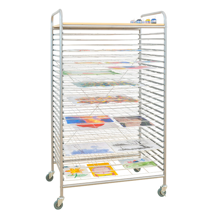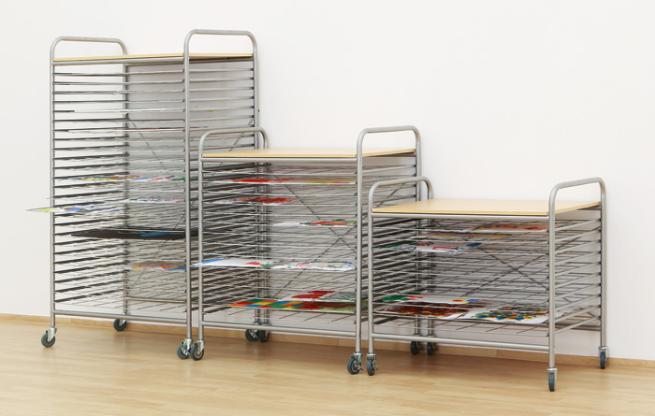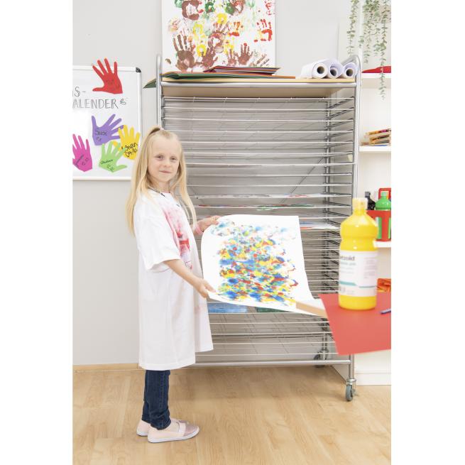 Mit einfach herausziehbaren Gitterrosten zum Trocknen von Bildern bis DIN A1. Gestell und Gitterroste bestehen aus galvanisch verzinktem Stahlrohr. 4 Laufrollen, 2 davon mit Feststellbremse, machen den Wagen mobil und standfest. Die obere Platte im Holz-Dekor sorgt für zusätzliche Ablagefläche.