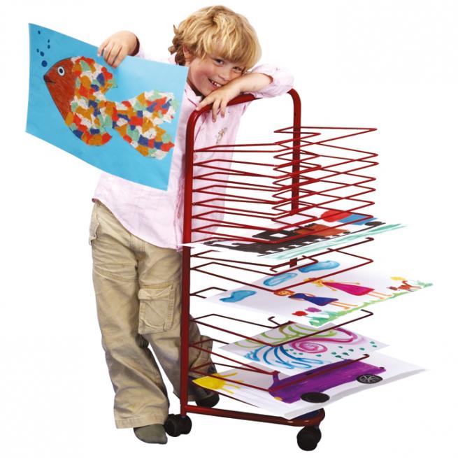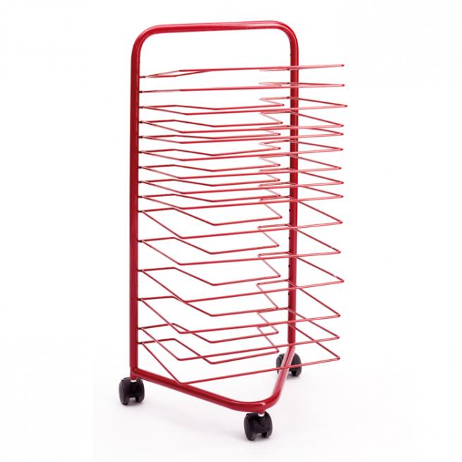 Dieser mobile Trocknungswagen bietet Platz für 15 Bilder in DIN A2 oder DIN A3. Der Wagen auf 3 Rollen ist aus lackiertem Metall und hat eine Größe von 85 x 40 x 29 cm.