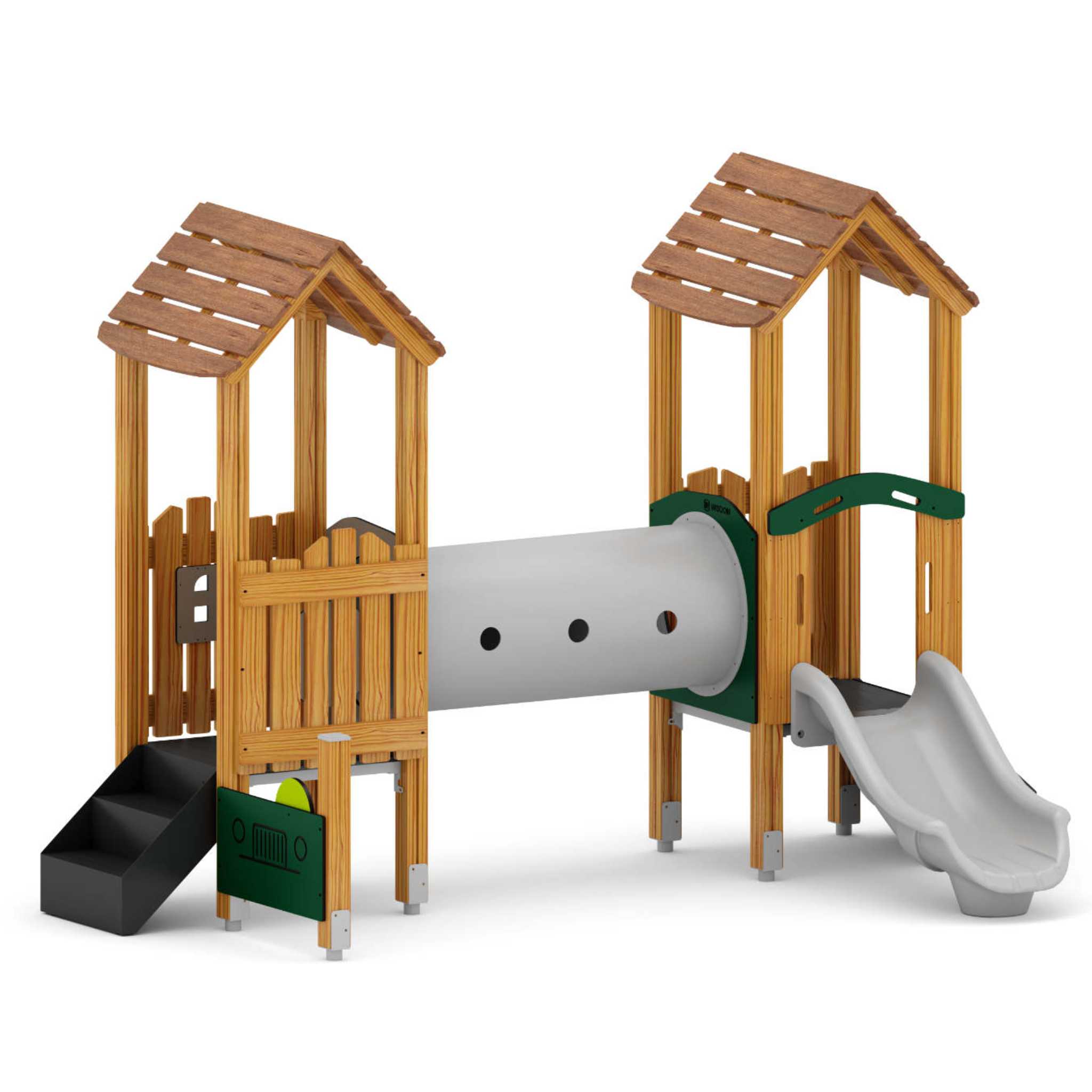 Die Grundkonstruktion des Türmchen-Duos Gute Aussicht besteht aus robustem und wetterfest imprägniertem Kiefernmassivholz. Auch die Dächer und Seitenwände sind aus Kiefernholz gefertigt, die Spielwände kombinieren es mit witterungsbeständigen Applikationen aus PE. Die Trittflächen-Beläge aus WPC (Holz-Kunststoff-Verbundwerkstoff) sind die ideale, robuste Grundlage für wildes Getrappel abenteuerlustiger Kinderfüße. Und auch Rutsche und Kriechtunnel, hergestellt aus strapazierfähigem LLDPE, halten dem intensiven Bespielen mühelos stand. Mini-Treppen und die äußerst niedrige maximale freie Fallhöhe von nur 60 cm sorgen dabei allseits für ein sicheres Bespielen. Mit dem Türmchen-Duo Gute Aussicht erhalten Sie ein langlebiges und sicheres Spielgerät, das den vielfältigen Anforderungen Ihres Kita-Alltags genügt.H x B x T montiert: 260 x 393 x 223 cm