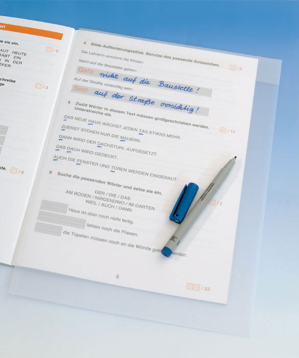 Papier sparen. Dabei hilft die Überhangfolie genauso wie bei Schwung- oder Schreibübungen. Sie oder Ihre Schüler beschriften die Folie mit wasserlöslichen Stiften. Dazu wird sie einfach auf die gewünschte Vorlage gelegt und schon kann es losgehen. Besonders eignet sich die Überhangfolie in den ersten Schuljahren für Schreib- und Schwungübungen, für Musterzeichnungen, Lückentexte und, und, und. Nutzen Sie die Folie in vielen Schulfächern. Abwischbar mit einem feuchten Schwamm oder Tuch.