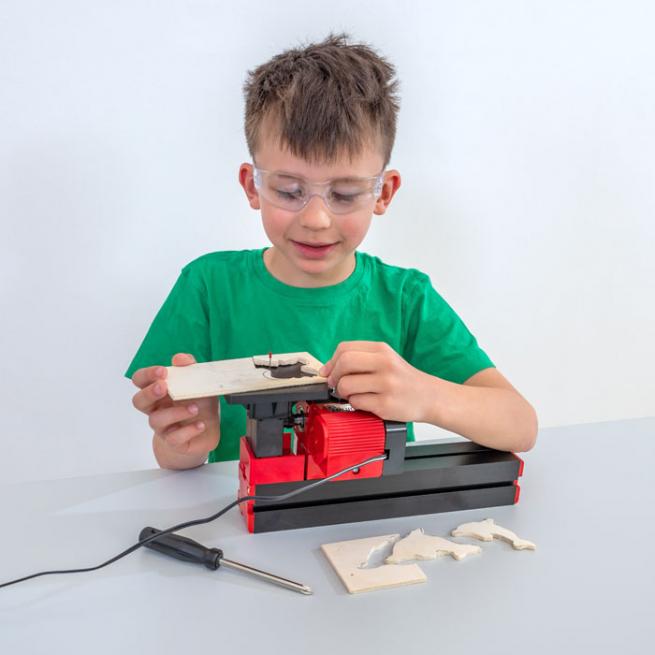 Optimales Set für die Grundschule zum Einstieg in die kreative Arbeit mit Holz. Zur Bearbeitung von Lernplanthemen. Drechseln, sägen, schleifen und bohren ist mit dieser 4-in-1-Maschine ein kindersicheres Vergnügen. Die tragenden Teile des UNIMATs bestehen aus stabilen Aluprofilen. Dank Kurzhub des Sägeblattes bleiben die Finger Ihrer Schüler unversehrt. Mit Schutzbrille.