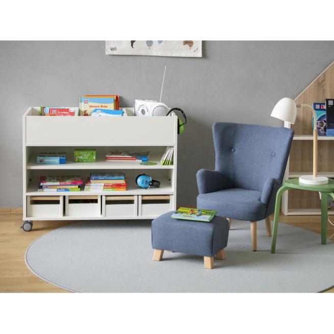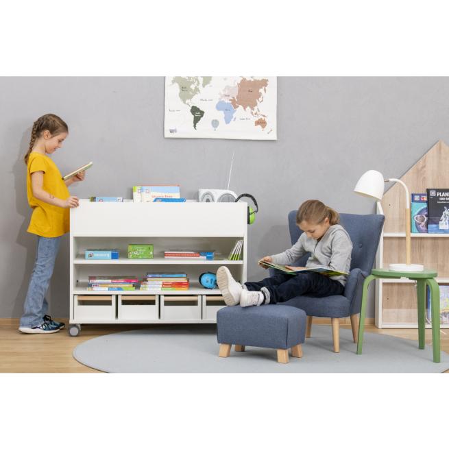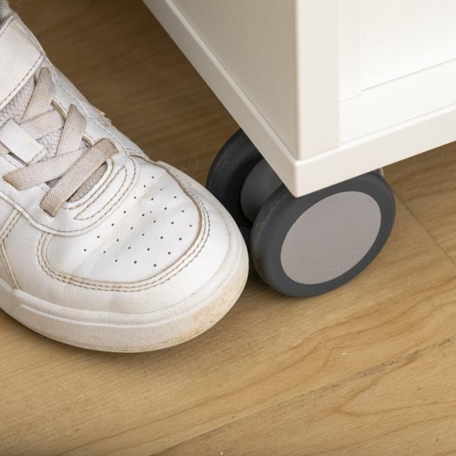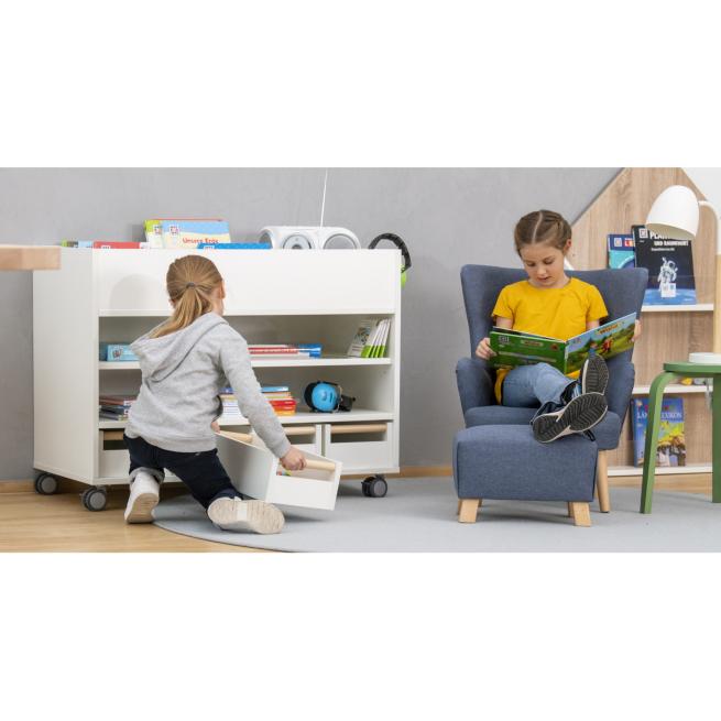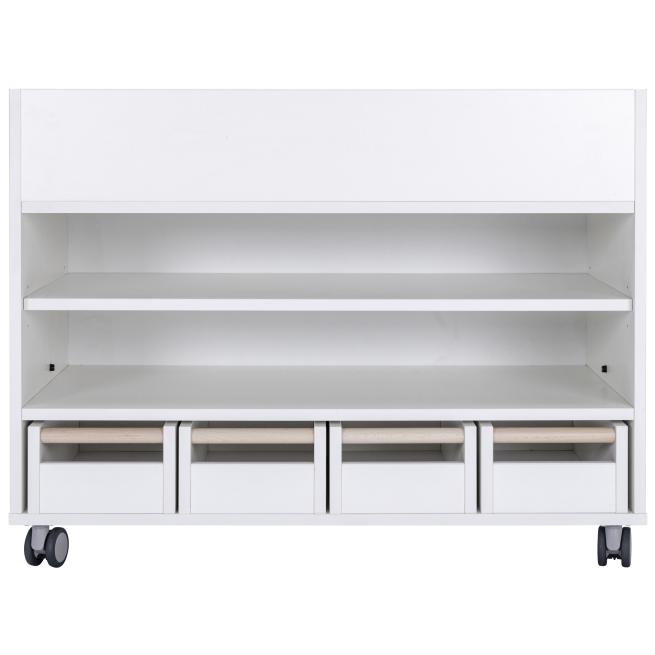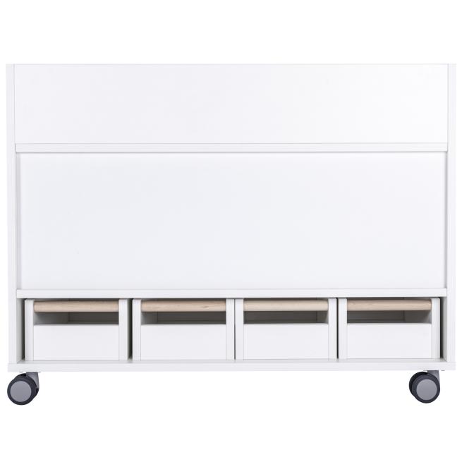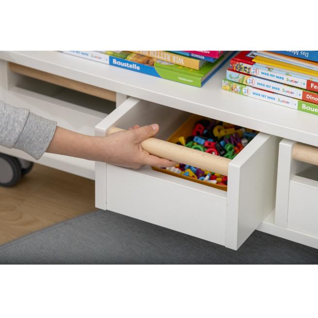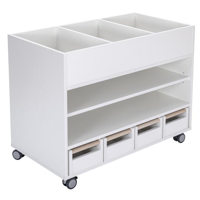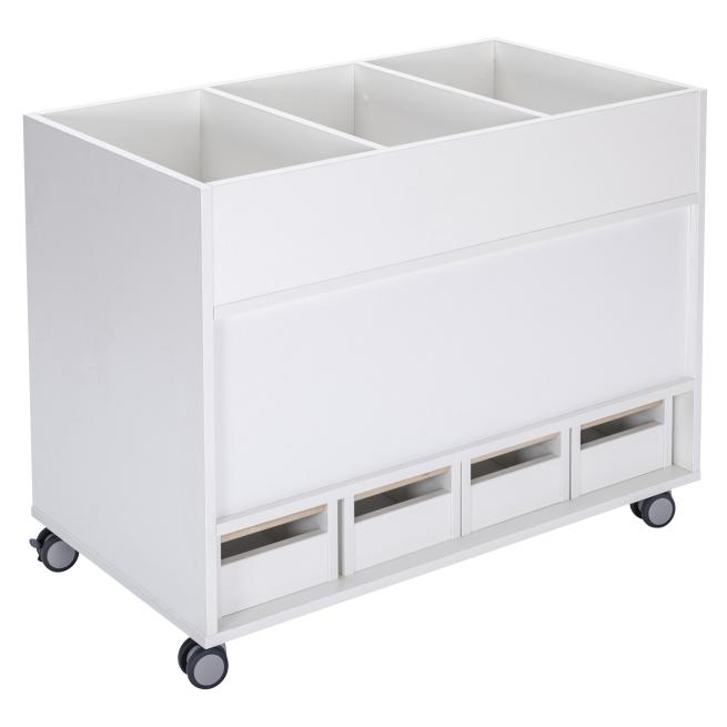 Drei Fächer oben, die Front mit zwei Ablagefächern, vier Materialkästen und vier Rollen für den mobilen Einsatz – so präsentiert sich der Universalwagen. Mit ihm schaffen Sie im Handumdrehen Ordnung und transportieren Ihre Bastelmaterialien, Bücher, Instrumente oder vieles mehr praktisch von A nach B.