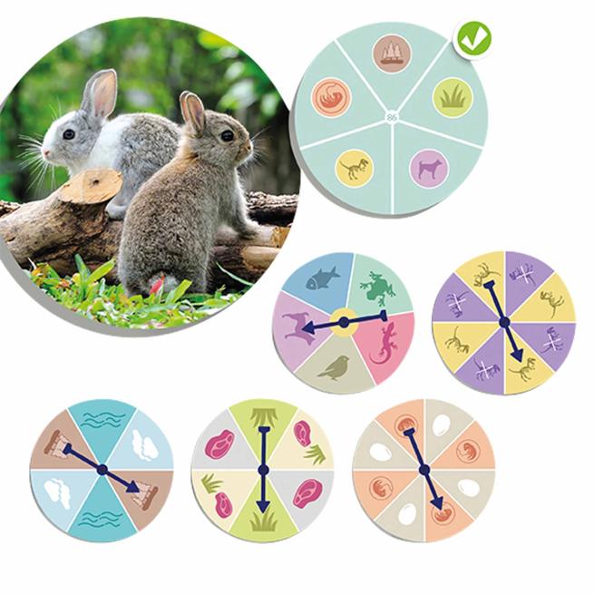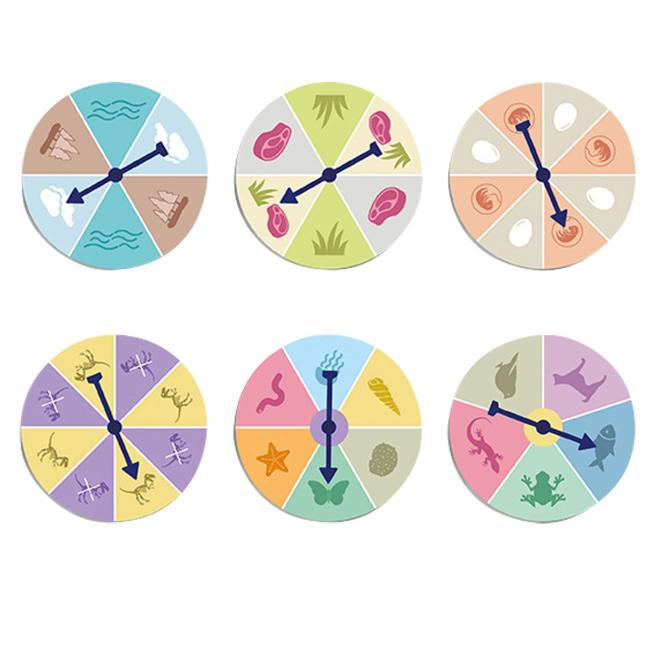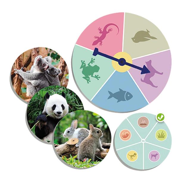 86 Bildkarten (bedruckt mit echten Tierfotos)6 Spielscheiben (mit drehbaren Pfeilen)