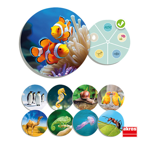 Legt ein Blauwal Eier? Sind Schweine die Könige der Lüfte? Und was fressen eigentlich Igel? Bei diesem spannenden Lernspiel finden Kinder im Alter von 5 bis 12 Jahren die passenden Antworten und erlangen allein, zu zweit oder in der Gruppe informatives Grundlagenwissen über die Tierwelt unseres Planeten. Das Spiel stellt dabei mithilfe von runden und beidseitig bedruckten Bildkarten insgesamt 86 Tierarten vor. Die Kids betrachten die Tiere über aussagekräftige Fotos und entdecken ihre Hauptmerkmale. Dabei geht es um die folgenden allgemeinen Eigenschaften: Ernährung (Fleischfresser/Pflanzenfresser/Allesfresser), Lebensraum (Land/Wasser/Luft), Fortpflanzung (eierlegend/lebendgebärend) und Innenskelett (Wirbeltiere/Wirbellose). Die Kinder lernen, die einzelnen Tiere nach diesen Hauptmerkmalen zu ordnen und nach ihren Eigenschaften zu identifizieren. Hierfür nutzen sie die Spielscheiben mit drehbaren Pfeilen und wählen nach dem Zufallsprinzip einzelne Eigenschaften aus. Dann suchen die Kids im Fundus der Bildkarten nach einem passenden Tier. Wahlweise lassen sich dabei mittels zweier spezieller Spielscheiben auch Wirbeltiere und Wirbellose näher klassifizieren: Wer findet am schnellsten ein im Wasser lebendes Säugetier oder einen Vertreter aus dem Stamm der Gliederfüßer?