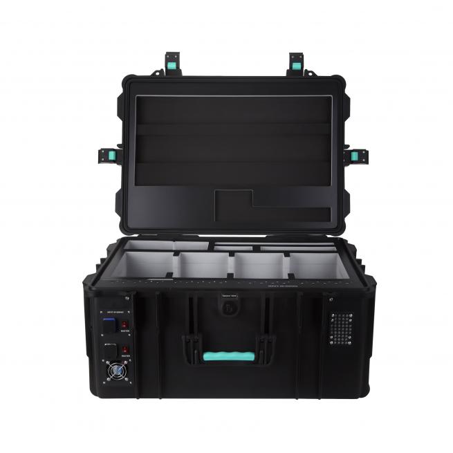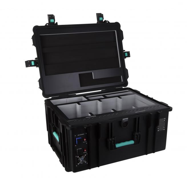 Lagern und laden. Die robusten Transportkoffer bieten Platz für Tablets oder iPads inklusive Schutzhüllen. In den staubdichten Koffern mit smarter Lüftungssteuerung und Timer laden Sie die mobilen Endgeräte energieeffizient bei optimalem Innenraumklima über die USB-C-Anschlüsse mit den Herstellerkabeln auf. Auch Zubehör und Adapter haben Platz. Dank patentiertem Einhand-Schnappverschluss inklusive Öffnungssicherung bedienen Sie die Koffer leicht.