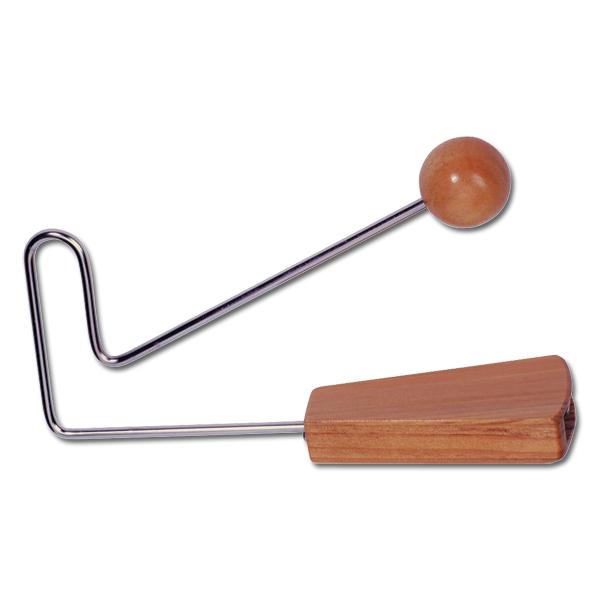 Der Spieler hält die Vibra-Slap am Federstahl und schlägt die Kugel leicht in die Hand. Die vibrierenden Stifte im Holz-Resonator erzeugen ein anhaltendes, klapperndes Geräusch, ähnlich wie bei einer Klapperschlange.
