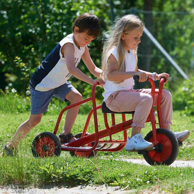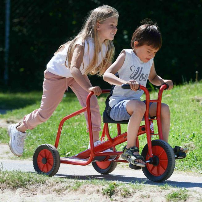 Das VIKING Ben Hur Dreirad bringt Bewegung, Rollenspiel und soziales Miteinander zusammen. Ein Kind sitzt am Steuer und tritt in die Pedale, damit das Dreirad fährt. Auf den beiden hinteren Trittflächen fahren bis zu zwei Kinder stehend mit und halten sich am Sicherheitsbügel fest. So entstehen in Kindergarten und Grundschule sofort neue Spielideen. Das Fahren fordert Körperkontrolle, Koordination sowie Wahrnehmung heraus und stärkt zugleich die spielerische Interaktion mit Gleichaltrigen. Für Kinder wirkt dieses Dreirad wie ein Magnet auf Rädern: aufsteigen, losfahren, gemeinsam spielen. Zur einfachen Selbstmontage.