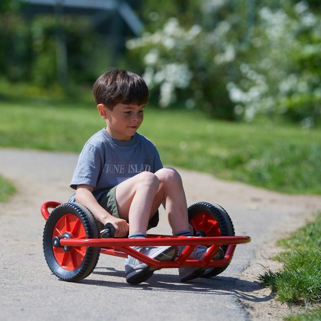 Klein, aber oho: Das VIKING Swingcart bringt ordentlich Schwung in den Außenbereich und funktioniert dabei ganz ohne Lenkrad und Pedale. Denn hier ist alles etwas anders: Zur Fortbewegung kurbeln die Kids die beiden Vorderräder an, wozu es der Kraft aus Händen, Armen und Brustkorb bedarf. Dabei nutzen die Kinder die beiden an den Rädern montierten Handgriffe, solide gummiert für exzellenten Halt beim Zupacken. Ihre Füße drücken die Kids einfach an den vorderen Fahrzeugrahmen aus stabilem Stahlrohr. Zum Lenken und Wenden des Swingcarts kurbeln die Kids die beiden Räder unterschiedlich stark an, während das robuste Hinterrad der zusätzlichen Stabilisierung beim Fahren dient. So meistern die kleinen Rennfahrer jede Strecke!